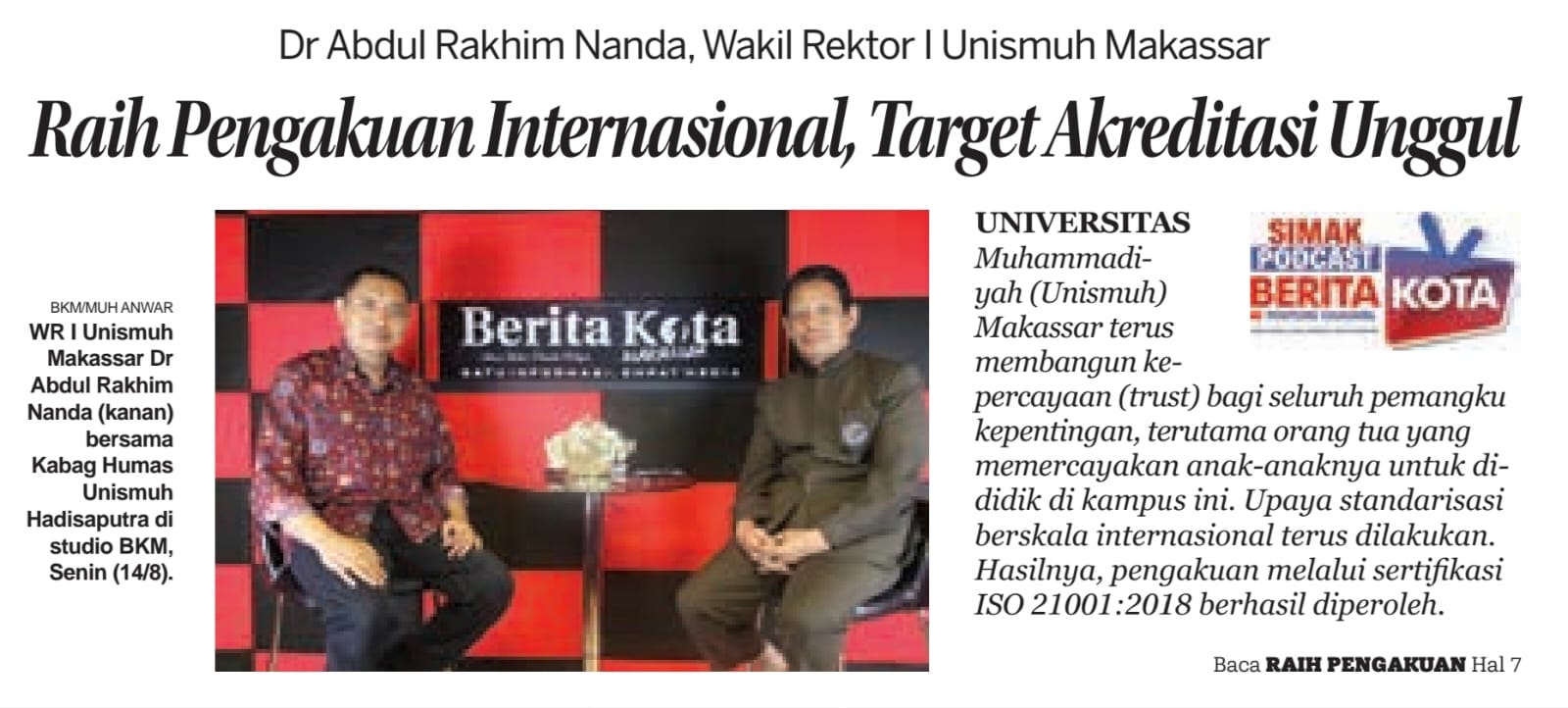 UNIVERSITAS Muhammadi­yah (Unismuh) Makassar terus membangun ke­percayaan (trust) bagi seluruh pemangku kepentingan, terutama orang tua yang memercayakan anak-anaknya untuk di­didik di kampus ini. Upaya standarisasi berskala internasional terus dilakukan. Hasilnya, pengakuan melalui sertifikasi ISO 21001:2018 berhasil diperoleh. WAKIL Rektor I Unismuh Makassar Dr Abdul Rakhim Nanda mengungkap hal itu ketika menjadi tamu siniar untuk kanal Youtube Berita Kota Makassa...
